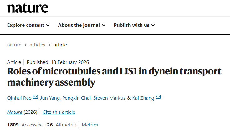 2月18日,南京医科大学生殖医学与子代健康全国重点实验室饶钦辉教授联合中国科学技术大学张凯教授,在国际顶级学术期刊Nature发表了题为“Roles of microtubules and LIS1 in dynein transport machinery assembly”的研究论文。该研究系统揭示了微管和关键调控因子LIS1协同调控动力蛋白运输机器组装与激活的分子机制,为理解细胞内物质运输的基本原理及相关疾病的发生机制提供了重要理论依据。