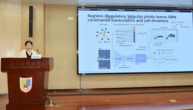 胡致远教授围绕“神经嵴细胞(Neural crest)命运决定的动态调控机制”展开报告。她首先从发育生物学经典问题切入,系统梳理了神经嵴在神经板边界形成、迁移、分化及多谱系命运建立中的关键阶段,强调神经嵴作为研究细胞可塑性与命运承诺的理想模型,对理解颅面发育、外周神经系统形成及色素细胞发生的重要意义。方法学层面,胡致远教授重点介绍了单细胞多组学与计算生物学融合框架在细胞命运研究中的应用。团队基于RNA velocity模型(RegVelo),利用剪接/未剪接RNA信息推断细胞状态的动态变化趋势,并通过轨迹重建解析神经嵴细胞从特化、剥离到迁移、分化的连续过程,揭示细胞轨迹并非线性静态,而是受调控网络驱动的高度动态可塑过程。同时,团队结合空间转录组与高分辨原位技术(如 MERFISH),将分子表达精准映射至胚胎空间结构,实现“时间轨迹—空间定位—调控网络”的一体化解析。团队据此提出从单细胞轨迹构建、基因调控网络(GRN)重建到疾病扰动预测的完整研究流程,为理解细胞命运偏移与疾病发生机制提供了新的定量研究框架。